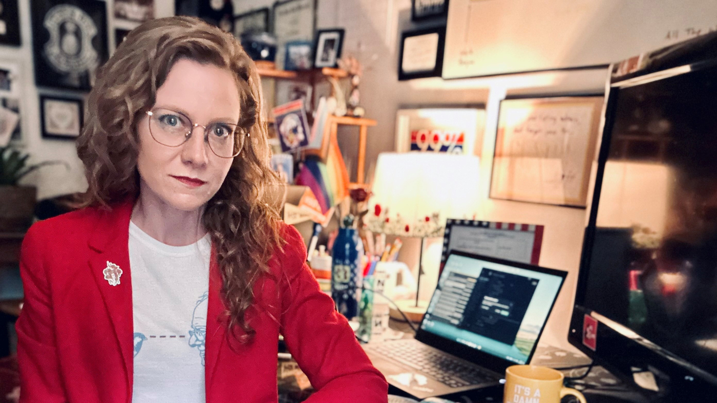 When it was time for a volunteer shift on the helpline, Meta usually logged in from her dorm room at Dickinson College in Pennsylvania. During a video interview with NPR, the room appeared cozy and warm, with twinkly lights strung across the walls, and a striped crochet quilt on the bed.