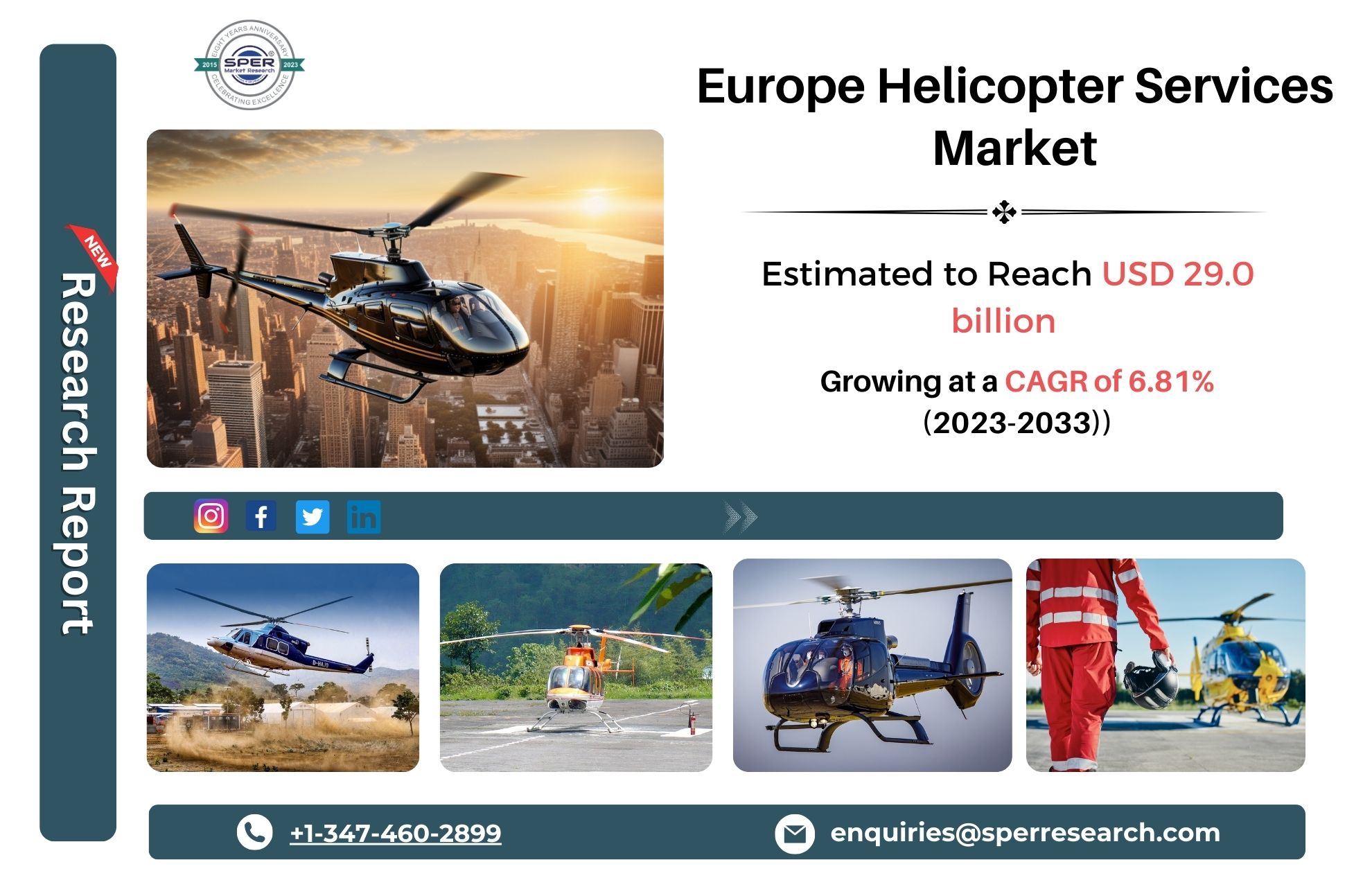 Europe Helicopter Services Market Size- By Type, By Product, By End User- Regional Outlook, Competitive Strategies and Segment Forecast to 2033’ state that the Europe Helicopter Services Market is predicted to reach USD 29 billion by 2033 with a CAGR of 6.81%.